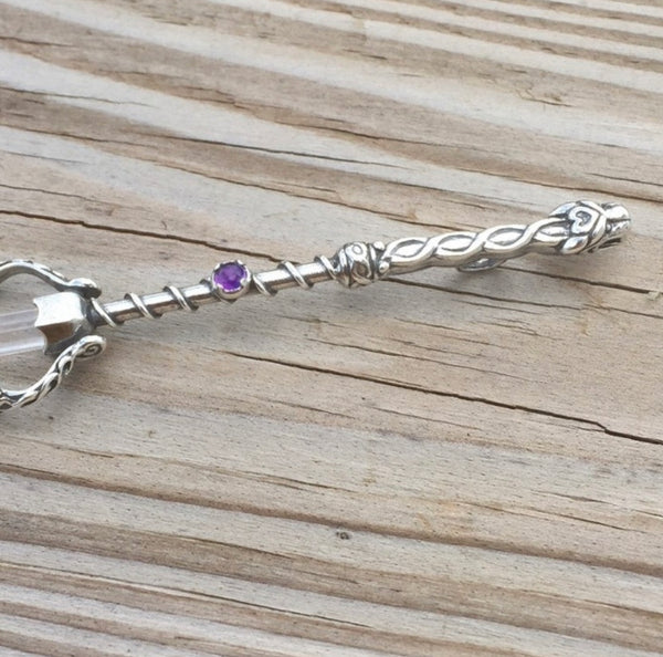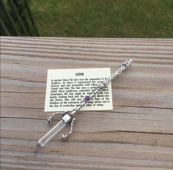 Celtic Lion Wand Pendant .925 Sterling Silver with natural Crystal Point and Genuine Amethyst USA