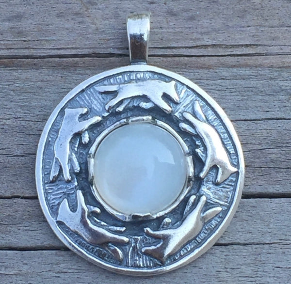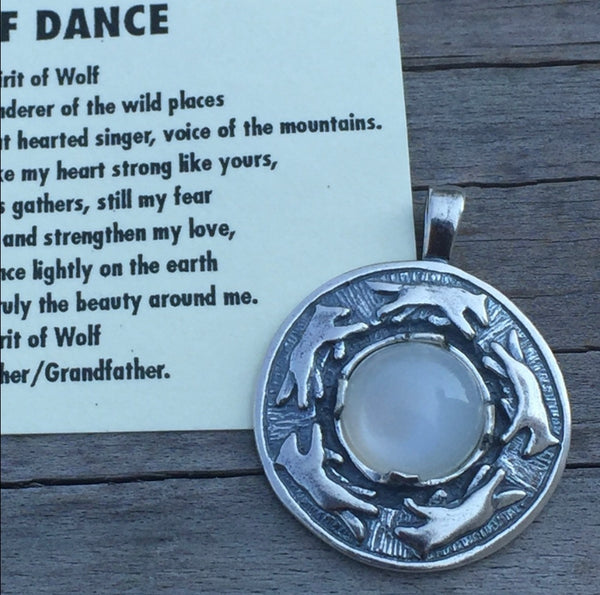 Wolf Dance Pendant .925 Sterling Silver w/ genuine 10mm Moonstone gem Made in USA