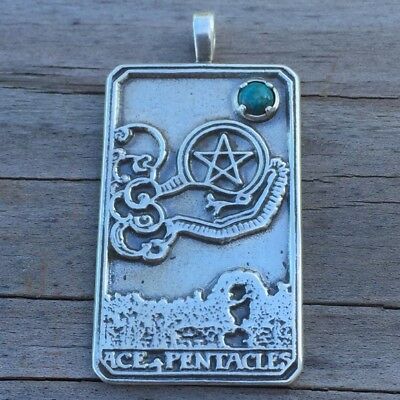 Ace of Pentacles Tarot Card Pendant .925 Sterling Silver w/ Natural Chrysocola gemstone