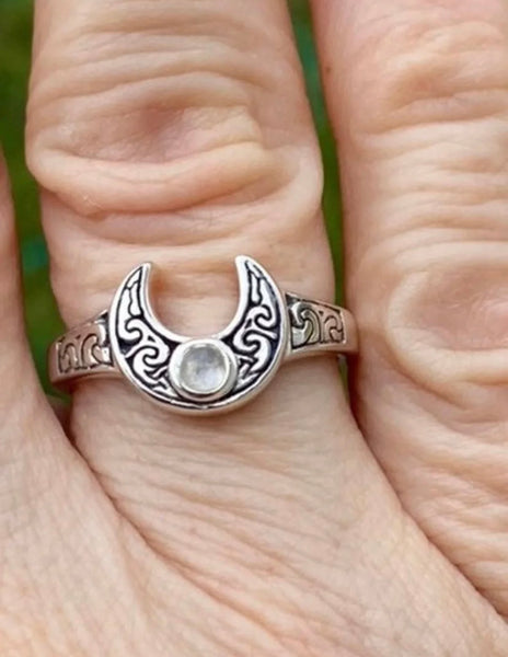 Horns Of Isis Moon Ring .925 Sterling Silver w/ genuine Rainbow Moonstone